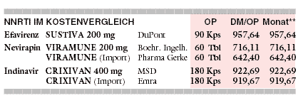 KOSTEN: Efavirenz (SUSTIVA) wird mit Monatskosten von 958 DM rund 4% teurer angeboten als der Proteasehemmer Indinavir (CRIXIVAN, monatlich 923 DM, als Reimport 920 DM). Die Neuerung kostet 33% mehr als der erste NNRTI Nevirapin (VIRAMUNE, monatlich 716 DM) und knapp 50% mehr als ein VIRAMUNE-Reimport (642 DM).