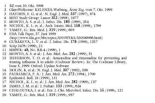 FAZIT: Der Neuraminidase-Hemmer Zanamivir (RELENZA) ist in Deutschland nur zur Frühbehandlung der Virusgrippe (Typ A und B) zugelassen. Nur bei Inhalation innerhalb von 36 Stunden nach Symptombeginn kann er bei ansonsten gesunden Erwachsenen die Dauer von Krankheitsbeschwerden um einen Tag verkürzen. Es mangelt jedoch an Erfahrungen gerade für den durch Influenza besonders gefährdeten Personenkreis, chronisch Kranke und Ältere. Auch fehlen Belege für einen Einfluss auf die Mortalität. Somit bleibt von der "Revolution" nichts therapeutisch wesentliches übrig - außer der Belastung des Budget. In Großbritannien darf Zanamivir deshalb - so der Stand bei Redaktionsschluss - nicht zu Lasten des National Health Service verordnet werden.20