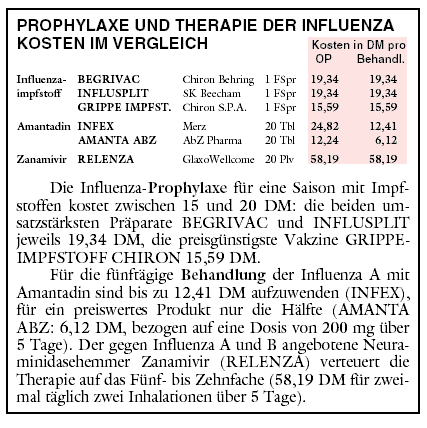 THERAPIE: Als erster Neuraminidase-Hemmer ist seit Anfang Oktober Zanamivir (RELENZA) auf dem Markt, in Deutschland ausschließlich zur Therapie der Virusgrippe A und B. Er hemmt das Virusenzym Neuraminidase, das für die Freisetzung von Viren aus infizierten Zellen erforderlich ist, und soll so die Ausbreitung des Influenza-Erregers in den Atemwegen verhindern. Wegen geringer oraler Bioverfügbarkeit muss Zanamivir inhaliert werden. Zweimal tägliche Inhalationen, mit denen innerhalb von 48 Stunden nach den ersten Influenzasymptomen begonnen werden muss, können die Dauer von Beschwerden um etwa einen Tag verkürzen (im Mittel von 6 auf 5 Tage).3-5 Je früher Zanamivir inhaliert wird und je kränker der Patient ist, umso stärker ist der mögliche Effekt. Zu Krankheitsbeginn lässt sich aber eine Influenza häufig noch nicht von anderen Atemwegsinfektionen abgrenzen. Insbesondere wenn keine Epidemie besteht, sind kostenträchtige Fehlverordnungen (knapp 60 DM pro Behandlung, siehe Kasten) mögliche Folge.