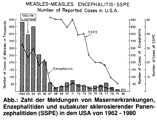 1. Da z. Zt. in aller Welt entweder die Schwarz-Vakzine oder Moraten-Vakzine verwendet wird, erscheint es nicht notwendig, hier besonders hinsichtlich deutscher und schweizer Masernimpfstoffe zu differenzieren. Die Statistik (vgl. Abbildung) aus den USA dokumentiert, daß der steile Abfall der SSPE mit dem Rückgang der dortigen Masern- und Masern-Enzephalitisfälle einherging. Wäre die Masernschutzimpfung ein Faktor für die Auslösung der SSPE, so müßte nach ihrem massiven dortigen Einsatz das Gegenteil, nämlich ein Anstieg der SSPE-Fälle, zu erwarten sein.