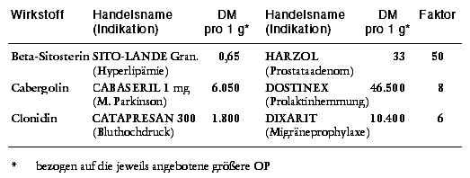 Entsprechend verhält es sich bei Clonidin, das bezogen auf den Grammpreis als Migräneprophylaktikum DIXARIT zu den sechsfachen Kosten des Hochdruckmittels CATAPRESAN angeboten wird. Das Mutterkornderivat Cabergolin kostet, bezogen auf die gleiche Wirkstoffmenge, als Prolaktinhemmer DOSTINEX das Achtfache des Parkinsonmittels CABASERIL.