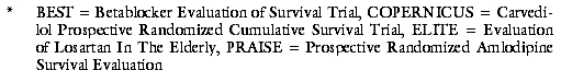 unter Losartan (LOZAAR) gegenüber Captopril (TENSOBON u.a.) verzeichnete. Dies ließ sich in ELITE II nicht bestätigen (a-t 1997; Nr. 4: 45 und 1999; Nr. 12: 127; Scrip 2000; Nr. 2524: 22).