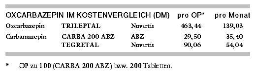 KOSTEN: Oxcarbazepin (TRILEPTAL, 139 DM/Monat bei täglich 1.200 mg) kostet das Zweieinhalbfache des Carbamazepin-Originals TEGRETAL (54