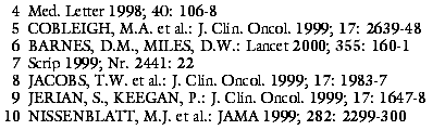 Eine kontrollierte Phase-III-Studie mit 469 Frauen, deren metastasierende Erkrankung nicht vorbehandelt ist, ist bisher nur als Kongressbeitrag vorgestellt worden. Danach bringt die Anwendung des Antikörpers zusätzlich zur Chemotherapie mit einem Anthrazyklin wie Doxorubicin (ADRIBLASTIN u.a.) plus Cyclophosphamid (ENDOXAN u.a.) oder Paclitaxel (TAXOL) einen Überlebensvorteil von 5 Monaten (25 vs. 20 Monate) gegenüber Chemotherapie allein.6,7
