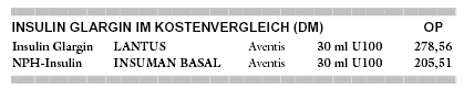 KOSTEN: Das Kunst-Basalinsulin Glargin (LANTUS) verursacht gegenüber NPH-Insulin pro Insulineinheit Mehrkosten von 35%.