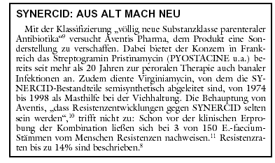 neue Kombiantibiotikum SYNERCID zu. Es enthält die Streptogramine* Quinupristin und Dalfopristin und ist ausschließlich angezeigt bei schweren