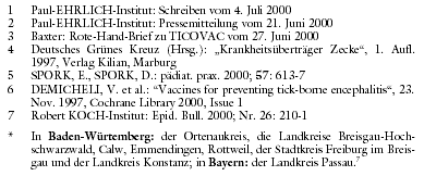 Am 20. Juni 2000 schränkte das PEI den Gebrauch von TICOVAC ein: Keine Impfung von Kindern bis zu drei Jahren, Halbierung der Dosis für ältere Kinder bis 15 Jahre bei erster Immunisierung auf 0,25 ml und Verwendung ausschließlich für Personen, die sich in einem nach offiziellen Empfehlungen ausgewiesenen FSME-Hochrisikogebiet* aufhalten.2 Diese Maßnahmen werden nicht greifen, wie die vorliegenden Berichte über Unverträglichkeiten des Impfstoffes zeigen. Im NETZWERK ist etwa jeder dritte betroffene Impfling unter 15 Jahre alt. 13 der Kinder mit zum Teil drastischem Fieberanstieg über 40 Grad Celsius und anhaltenden Kopfschmerzen, starkem Erbrechen und/oder Gliederschmerzen haben bereits die erniedrigte Dosis (0,25 ml) erhalten. Dosishalbierung schützt somit nicht vor den gravierenden Impffolgen. Dies stellt der Hersteller Baxter auch in seinem jüngsten Rote-Hand- Brief fest.2 Wenn erst jetzt angesichts des eingetretenen Desasters "Dosisoptimierungsstudien" geplant sind (a-t 2000; 31: 55), ist das ein Skandal. Auch bei älteren Personen und Herz-Kreislaufkranken wird jetzt zur Zurückhaltung geraten.3