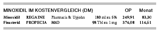 KOSTEN: Die zweimal tägliche Anwendung von 1 ml Minoxidil 5% (REGAINE) kostet im Monat 83 DM und ist damit rund 25% preiswerter als die