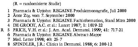 kosmetisch befriedigt, ist kaum vorstellbar. Nach Absetzen lichtet sich das Haar wieder - bisweilen stärker als zu Beginn der Behandlung (a-t 1992; Nr. 10: 100).5 Ein Vergleich mit dem ebenfalls gegen androgenetischen Haarausfall zugelassenen