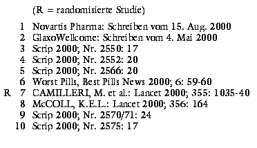 FAZIT: Wenn Sie jetzt in der medizinischen Presse zunehmend Berichte über das Reizdarmsyndrom finden, liegt das daran, dass der Markt für die Einführung neuer Arzneimittel vorbereitet wird. Die bisherigen Daten zu Tegaserod (vorgesehenes Warenzeichen: ZELMAC) und Alosetron (USA: LOTRONEX) begründen erhebliche Zweifel an Nutzen und Sicherheit.