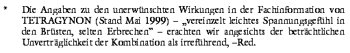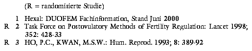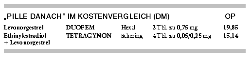 KOSTEN: Die postkoitale Verhütung mit Levonorgestrel (DUOFEM) kostet 20 DM und damit 30% mehr als die Östrogen-Gestagen-Kombination TETRAGYNON (15 DM). Für das österreichische Levonorgestrel-Präparat VIKELA sind 179 ATS aufzuwenden.