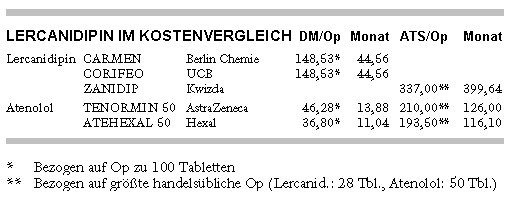 Lercanidipin (CARMEN, CORIFEO) verteuert die Hochdruckbehandlung mit knapp 45 DM pro Monat für täglich 10 mg gegenüber dem