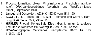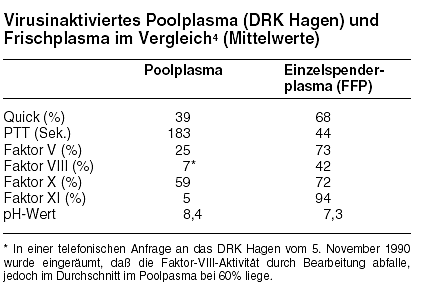 Die DRK-Blutbank Hagen bietet seit Mai 1990 lyophilisiertes virusinaktiviertes Blutplasma an. In der Produktinformation lautet es:1 "Das