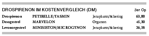 KOSTEN: Die Dreimonatspackung YASMIN/PETIBELLE kostet 63 DM und damit mehr als das Doppelte einer Levonorgestrel-haltigen Pille wie