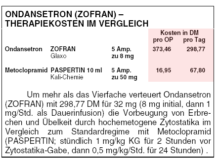 Folgetag nach abdomineller Bestrahlung ist es niedrig dosiertem Metoclopramid lediglich gleichwertig. Deshalb und wegen der extrem hohen Kosten (s. Kasten) sollte