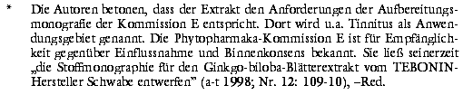 Tinnitus - Ginkgo-biloba-Extrakt (KAVERI, TEBONIN u.a.) ohne Nutzen: Der als "Durchblutungsförderer" vermarktete Ginkgo- biloba-Extrakt (KAVERI u.a.) wird auch zur Behandlung von Ohrgeräuschen (Tinnitus) empfohlen. Ein Nutzen ist nicht hinreichend belegt (a-t 1997; Nr. 8: 83-5). Jetzt ist die bislang größte kontrollierte Studie mit Ginkgo-biloba-Extrakt bei Tinnitus erschienen. Mehr als 1.000 Patienten nehmen zwölf Wochen lang dreimal täglich 50 mg Ginkgo-biloba-Extrakt* oder Plazebo ein. Nach vier und zwölf Wochen sowie zwei Wochen nach Absetzen werden sie zu Veränderungen des Tinnitus befragt. Ginkgo biloba wirkt demnach gegen Ohrgeräusche nicht besser als das Scheinmedikament (DREW, S., DAVIES, E.: BMJ 2001; 322: 73-5). Ginkgo-biloba-haltige Monopräparate werden in deutschen Apotheken für rund 440 Millionen DM/Jahr (Apothekenabgabepreis) verkauft. Bei einer Tagesdosis von 150 mg bzw. 160 mg entstehen Monatskosten von 54,15 DM (100 KAVERI 50 mg: 60,17 DM) bzw. 60,65 DM (120 TEBONIN SPEZIAL 80 mg: 121,30 DM). Wir raten von der Verordnung des unreinen Plazebos ab, -Red.