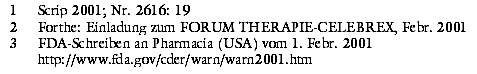 Pharmacia und Pfizer verstärken indes das Marketing für "die am häufigsten verordnete Neueinführung der Welt"2 und lassen in diesen Wochen mit "Kostenersatz" von 254,50 DM honorierte CELEBREX-Workshops durchführen (vgl. a-t 2000; 31: 49-50).2 In welche Richtung die "Kommunikation zu Eigenschaften, Nutzen und Anwendungsmöglichkeiten des Arzneimittels CELEBREX"2 dort beim Imbiss wohl laufen wird? In den USA wurde Pharmacia mehrfach von der FDA abgemahnt, weil bei Telefonkonferenzen mit Ärzten wesentliche Risiken von Celecoxib - z.B. bedrohliche Magen-Darm-Schäden, Unverträglichkeit wegen Sulfonamidstruktur oder Blutungen durch Interaktion mit Cumarin-Antikoagulantien - verschwiegen und unbelegte Vorteile gegenüber anderen NSAR behauptet wurden.3