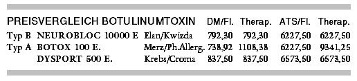Botulinumtoxin B kostet mit 792 DM pro Behandlung mit 10.000 E. 28% weniger als das Botulinumtoxin-Typ-A-Präparat BOTOX (1.108 DM für eine Behandlung mit 150 E.). Es ist etwa 5% günstiger als das BoNTA-Präparat DYSPORT (838 DM pro Behandlung mit 500 E.; Wirkverhältnis BOTOX/DYSPORT etwa 1:3)2.