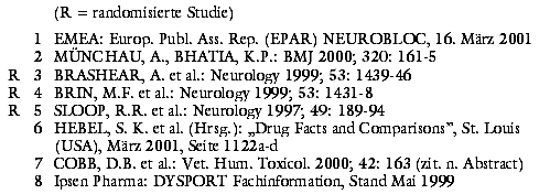 UNERWÜNSCHTE WIRKUNGEN: Die häufigsten Störwirkungen in klinischen Studien sind anticholinerge Effekte wie Mundtrockenheit (14% bis 44%) und Schluckbeschwerden (11% bis 28%). Beide nehmen mit steigender Dosis zu, Schluckstörungen besonders nach hoher Dosis in den M. sternocleidomastoideus (Kopfnickermuskel). Häufig wird auch über Schmerzen an der Einstichstelle, Verdauungsstörungen, Stimm- und Geschmacksveränderungen und Myasthenie geklagt. Als immunogene Reaktion kann ein grippeähnliches Syndrom auftreten. Auch BoNTB ruft bei wiederholter Anwendung neutralisierende Antikörper hervor, nach bisherigen Daten bei 6%.1