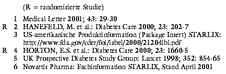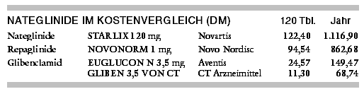 KOSTEN: Einnahme von dreimal täglich 120 mg Nateglinide (STARLIX) verteuert mit 1.117 DM pro Jahr die Diabetes-Behandlung gegenüber der Therapie mit Repaglinide (NOVONORM; 863 DM/Jahr für dreimal täglich 1 mg) um 30%. Im Vergleich zu täglich 7 mg Glibenclamid ist sogar das 7- bis 16-fache aufzuwenden (EUGLUCON N: 149 DM/Jahr; GLIBEN 3,5 VON CT: 69 DM/Jahr).