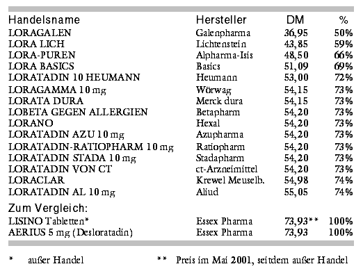 saisonaler allergischer Rhinitis zugelassen. Der Preisvergleich gibt die Kosten in DM von jeweils 50 Tabletten wieder (Preisstand 1. Juli 2001, Prozentangaben in