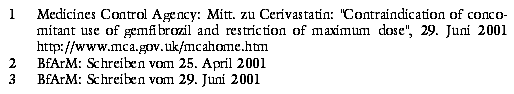 Wir sehen auch bei Beachtung dieser Einschränkungen keine Indikation für Cerivastatin (LIPOBAY, ZENAS). Warum muss ein riskanterer, weniger gut geprüfter CSE-Hemmer auf dem Markt bleiben? Die für CSE-Hemmer relevanten Studien mit klinischen Endpunkten wurden mit Lovastatin (MEVINACOR), Pravastatin (PRAVASIN u.a.) und Simvastatin (DENAN, ZOCOR) durchgeführt und nicht mit Cerivastatin.