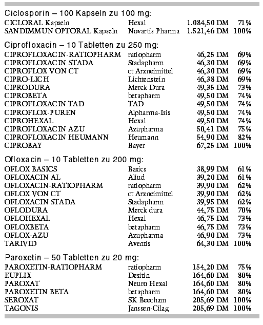 Preisvergleich nennt die Kosten für die jeweils meist verordneten Packungsgrößen (Preisstand 1. Sept. 2001).