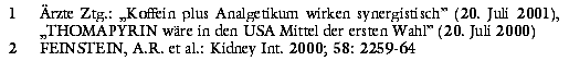 Die den "neuen Daten" zu Grunde liegenden Reviews genügen nicht den wissenschaftlichen Standards (offenbar keine gezielte systematische Literaturrecherche, sondern "Zusammentragen" von Quellen u.a.) und eignen sich daher nicht, die begründeten Sicherheitsbedenken gegen Koffein-haltige Schmerzmittelkombinationen vom Typ THOMAPYRIN auszuräumen. Die nach aktuellen Schätzungen 2.000 bis 4.000 dialysepflichtigen Analgetika-Nephropathien in Verbindung mit der Einnahme von Schmerzmittelkombinationen in Deutschland lassen sich durch Expertenmeinung nicht wegdiskutieren (vgl. a-t 1994; Nr. 1: 16 und 1998; Nr. 2: 13-4). Solche Kombianalgetika werden nicht benötigt, -Red.