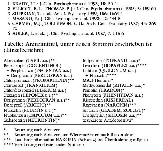 Stottern beeinträchtigt flüssiges Sprechen durch Lautverlängerung, Wiederholen, Auslassen oder Verwechseln von Silben bzw. ganzen Worten. Im Gegensatz zum so genannten "Entwicklungsstottern" von Kindern und Jugendlichen betrifft erworbenes Stottern alle Lebensalter, beginnt akut und ist oft Folge herabgesetzter Hirnfunktion z.B. nach Schlaganfall oder Schädelhirntrauma.1 In der Literatur finden sich zahlreiche Berichte über plötzlich auftretendes Stottern in Verbindung mit Arzneimitteln (Tabelle). Der Verdacht eines Zusammenhangs erhärtet sich, wenn die Sprechstörung nach Absetzen verschwindet und bei Reexposition erneut auftritt.