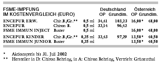 Aktionspreisen (2. Jan. bis 31. Juli 2002) ist FSME-Impfstoff in Österreich über die Hälfte preiswerter als in Deutschland.