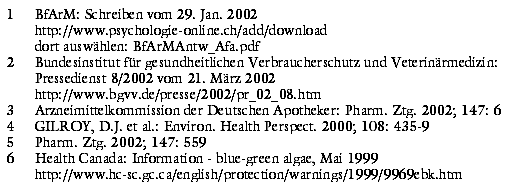 Gesundheitsbehörde von Oregon von 1996 enthielten 85 von 87 Proben Mikrozystine*, die aus einer mit der AFA-Alge koexistierenden Algenspezies stammen.