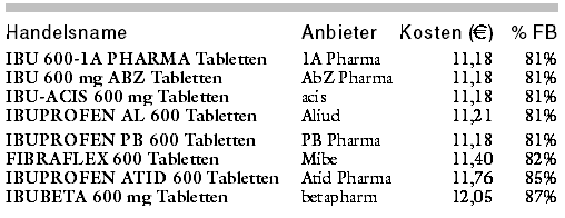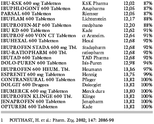 In der folgenden Tabelle werden die Kosten der in der Qualität bestätigten Produkte auf der Basis von Packungen zu 50 Tabletten mit 600 mg Ibuprofen