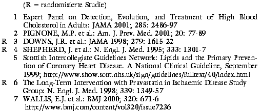Das Ausmaß, in dem Patienten mit Hypercholesterinämie von der medikamentösen Behandlung profitieren, scheint von der Höhe ihres von verschiedenen Faktoren - Alter, Geschlecht, Blutdruck, Glukosestoffwechsel u.a. - beeinflussten Risikos abzuhängen, eine koronare Herzkrankheit zu entwickeln oder einen Herzinfarkt zu erleiden. Für Menschen ohne koronare Herzkrankheit und mit relativ niedrigem koronaren Risiko (unter 1,5% pro Jahr) ist zwar ein günstiger Effekt von Lovastatin (MEVINACOR) auf die Gesamtrate der Herzinfarkte, der instabilen Angina pectoris und des plötzlichen Herztodes belegt, die Sterblichkeit bleibt jedoch unbeeinflusst.3 Nach der WOSCOP*-Studie mit Pravastatin (PRAVASIN) ergibt sich in der Primärprävention bei einem jährlichen Risiko von 1,5% (a-t 2000; 31: 102-3)4 nur ein Trend zu verringerter Gesamtsterblichkeit.