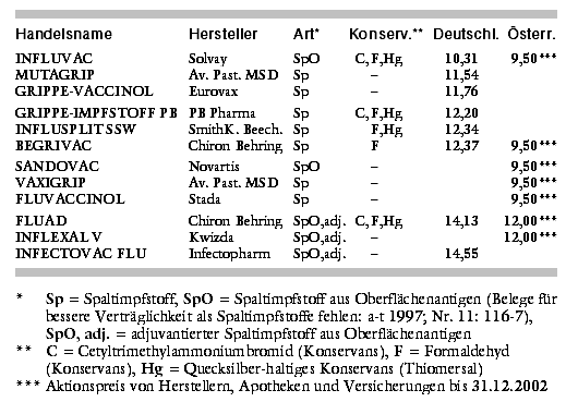 Die Preise der konventionellen Impfstoffe weichen in Deutschland bis 17% voneinander ab (INFLUVAC 10,31 €/ Spritzampulle = 83% und BEGRIVAC 12,37 €/Spritzampulle = 100%), in Österreich beträgt der reduzierte Aktionspreis bis Ende Dezember 2002 einheitlich 9,50 €. Konservierungsmittelfrei sind GRIPPE-VACCINOL, MUTAGRIP und INFECTOVAC FLU, in Österreich FLUVACCINOL, INFLEXAL V und VAXIGRIP (vgl. Tabelle). BEGRIVAC enthält lediglich Formaldehyd, INFLUSPLIT SSW zudem das Quecksilberkonservans Thiomersal. GRIPPEIMPFSTOFF PB, INFLUVAC und FLUAD sind darüber hinaus mit Cetyltrimethylammoniumbromid konserviert.