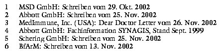 Statt unsere Anfrage zu Art und Häufigkeit schwerer Ereignisse in Verbindung mit dem monoklonalen Antikörper Palivizumab (SYNAGIS) konkret zu beantworten, teilt uns Abbott mit, dass "sich aus den ... zur Verfügung stehenden Daten keine grundlegende Änderung des wissenschaftlichen Kenntnisstandes gegenüber der Erstzulassung ... erkennen" lasse.2 Nur einen Tag später warnt der Palivizumab-Hersteller in den USA in einem Dear Doctor Letter vor Hypersensitivitätsreaktionen auf den Antikörper (s. Seite 130).3 Diese Warnung fehlt hierzulande in der Fachinformation.4 Die Schadwirkung ist erst in der Postmarketing-Phase aufgefallen.