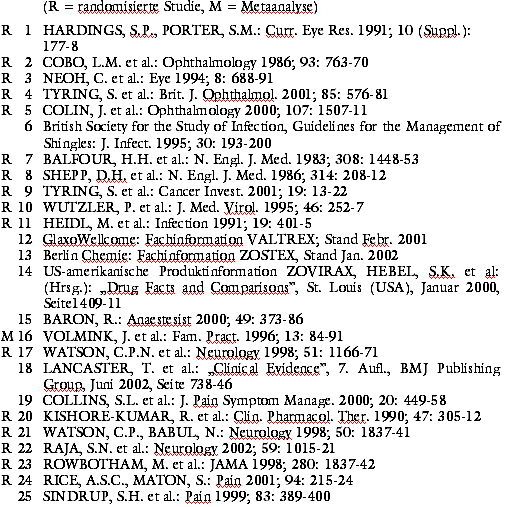 HERPES ZOSTER BEI IMMUNSUPPRESSION UND ZOSTER-KOMPLIKATIONEN: Bei Herpes zoster auf dem Boden einer immunsupprimierenden Grunderkrankung oder Therapie soll die antivirale Behandlung den potenziell lebensbedrohlichen Komplikationen vorbeugen. Zum Nutzen von intravenös verabreichtem Aciclovir (3-mal 500 mg/m2 Körperoberfläche/Tag, über 7 Tage) liegt eine plazebokontrollierte Studie mit 94 Patienten vor, die an lymphoproliferativen oder anderen Malignomen erkrankt sind oder ein Knochenmark- oder Nierentransplantat erhalten haben. Aciclovir senkt das Risiko einer schweren kutanen oder viszeralen Dissemination von 26% auf 2% (NNT = 5). Bei 8 (19%) von 42 Patienten der Plazebogruppe entwickelt sich ein lebensbedrohlicher Zustand, der als Therapieversagen gilt und eine Indikation für die antivirale Therapie außerhalb des Studienprotokolls darstellt. Drei Patienten versterben. In der Aciclovirgruppe kommt Therapieversagen nicht vor.7 In einer kleinen Studie mit 22 Patienten wirkt Aciclovir i.v. signifikant besser als das ältere, hierzulande als Injektion nicht erhältliche Virustatikum Vidarabin (Frankreich: VIRA-MP).8
