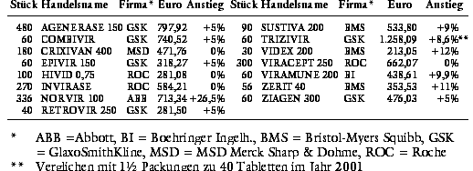 Tabelle: Antiretrovirale Mittel - Preise Ende 2002 und Kostensteigerung im Vergleich zum Vorjahr
