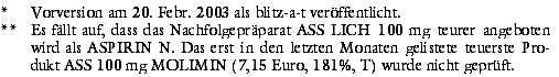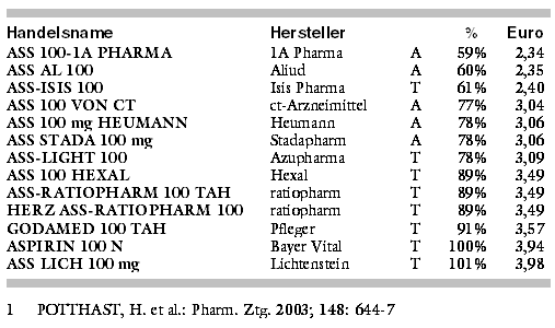Kurz und bündig a-t 3/2003; 34: 31 teilen merken drucken Präparate mit 100 mg Azetylsalizylsäure im Qualitätsvergleich: Das Zentrallaboratorium Deutscher Apotheker überprüft in einer vergleichenden Untersuchung die Qualität von 13 Fertigarzneimitteln mit 100 mg schnell freisetzender Azetylsalizylsäure,1 die als Analgetika beziehungsweise Thrombozytenaggregationshemmer angeboten werden. Das Ergebnis ist erfreulich: Der Wirkstoffgehalt aller Präparate entspricht der Deklaration (98,6 bis 104,2 Prozent der deklarierten Wirkstoffmenge). Alle Produkte setzen ASS innerhalb von 30 Minuten vollständig frei (nach 15 Minuten bereits mindestens 85% des Wirkstoffs).1 Bei gleicher Qualität wird der Preis zum relevanten Auswahlkriterium. In der folgenden Tabelle vergleichen wir die Kosten der geprüften Präparate auf der Basis der OP zu 100 Tabletten** (Preise in €, Prozentangaben auf der Basis des Festbetrages von 3,94 € = 100%, A = als Analgetikum deklariert, T = als Thrombozytenaggregationshemmer deklariert): © 2003 arznei-telegramm Autor: Redaktion arznei-telegramm | Wer wir sind und wie wir arbeiten Diese Publikation ist urheberrechtlich geschützt. Vervielfältigung sowie Einspeicherung und Verarbeitung in elektronischen Systemen ist nur mit Genehmigung des arznei-telegramm® gestattet. × Teilen E-Mail (Outlook) Bluesky WhatsApp Link kopieren