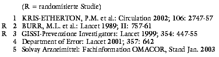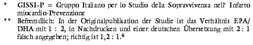 OMACOR, ein Konzentrat von Omega-3-Fettsäuren aus Fischöl, senkt nach einer großen randomisierten offenen Studie aus der Mitte der 90er Jahre die Sterblichkeit nach Herzinfarkt von 9,6% auf 8,3% (NNTJahr = 270).
