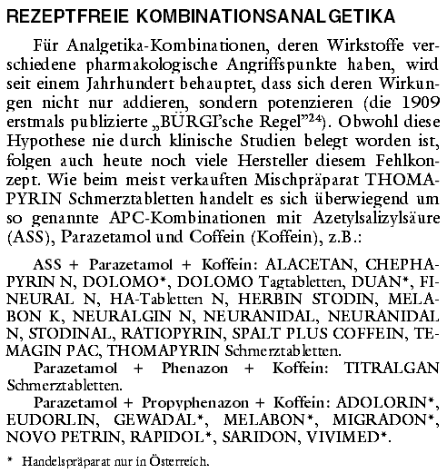 Mischanalgetika, z.B. mit Parazetamol, Azetylsalizylsäure und Koffein (THOMAPYRIN u.a.; a-t 2002; 33: 117-8; s.