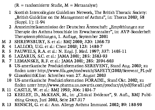 Die US-amerikanische Arzneimittelbehörde weist allerdings darauf hin, dass anhand der SMART-Studie nicht hinreichend geklärt werden kann, ob gleichzeitiger Gebrauch inhalativer Kortikosteroide vor dem erhöhten Sterblichkeitsrisiko unter Salmeterol schützt.8 Die Subgruppenanalyse, die diese These stützt, ist nachträglich eingeführt9 und daher mit Vorsicht zu interpretieren. Aus Beobachtungsstudien finden wir zwar keine eindeutigen Hinweise auf erhöhte Asthmasterblichkeit unter Salmeterol. Eine vor zehn Jahren publizierte große randomisierte kontrollierte Studie ließ aber ebenfalls eine numerisch erhöhte Mortalität unter Salmeterol im Vergleich mit regelmäßig inhaliertem kurzwirkendem Salbutamol (SULTANOL u.a.) erkennen. Bei 10 der 14 an ihrem Asthma verstorbenen Patienten soll auch hier die Kortikosteroid-Therapie unzureichend gewesen sein.11** Randomisierte kontrollierte Langzeitstudien, die die Sterblichkeit unter langwirksamen Betamimetika als Zusatz zur lege artis verwendeten Kortikosteroidtherapie überprüfen, erscheinen uns jetzt dringend geboten.