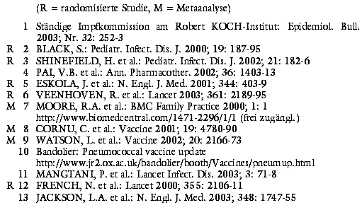 Wir sehen keine Basis für eine generelle Impfung aller Säuglinge gegen Pneumokokken. Die Ständige Impfkommission (STIKO) empfiehlt die Impfung nur für Kinder mit erhöhtem Risiko. Bei Säuglingen und Kleinkindern, für die der stärker immunogene Konjugatimpfstoff PREVENAR zugelassen ist (a-t 2001; 32: 38-9), sind dies neben Kindern mit chronischen Erkrankungen oder Immundefekt Frühgeborene und Kinder mit Geburtsgewicht unter 2.500 g.1 In einer großen US-amerikanischen Studie lassen sich durch die Impfung invasive Pneumokokken-Erkrankungen mit den in der Vakzine enthaltenen sieben Serogruppen bei gesunden Kindern zuverlässig verhindern.2 Dies gilt nach - offenbar nicht prädefinierten - Subgruppenanalysen auch für gesunde Frühgeborene und Kinder mit geringem Geburtsgewicht.3 Entsprechende Nutzenbelege für Europa, wo wegen eines anderen Spektrums vorherrschender Serogruppen mit geringerer Wirksamkeit zu rechnen ist, sind nach wie vor nicht publiziert. In Deutschland ist andererseits wegen des geringeren Anteils penizillinresistenter Pneumokokken von einer höheren Erfolgsrate der Antibiotikatherapie auszugehen. Bei Kindern mit Sichelzellanämie wirkt die Impfung nachweislich immunogen. Belege für einen klinischen Nutzen der Impfung im Sinne eines Schutzes vor invasiven Infektionen finden wir dagegen für kranke Kinder nicht.4 Zwei europäische Studien zur Prävention der Otitis media mit Konjugatimpfstoff - allein oder in Kombination mit Boosterung durch Polysaccharidimpfstoff - kommen zu negativem Ergebnis.5,6