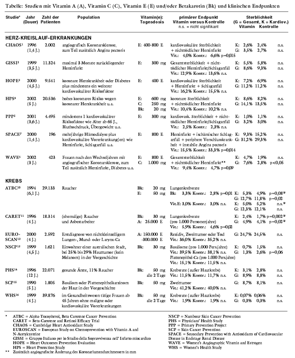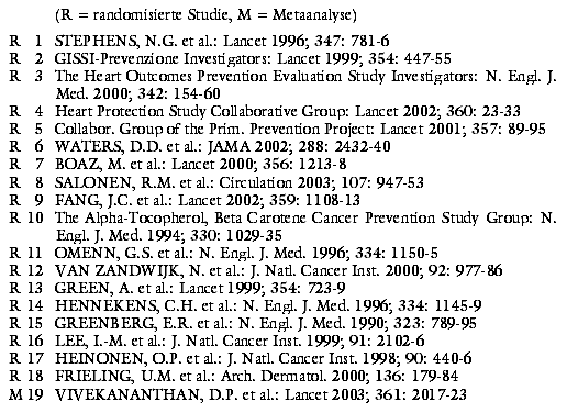 KREBS: In sieben Studien10-16 wird der Effekt von Antioxidanzien, vor allem Betakarotin, auf verschiedene Malignome geprüft. Zwei