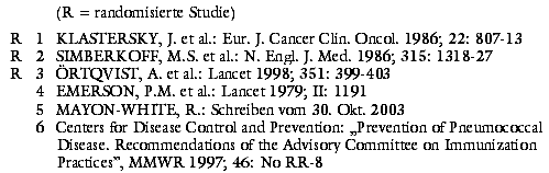 Unseres Wissens liegen - wie für andere Risikogruppen - auch für Patienten nach Splenektomie oder mit funktioneller Asplenie keine Ergebnisse aus randomisierten kontrollierten Studien vor, die einen klinischen Nutzen der Pneumokokken-Impfung (PNEUMOVAX u.a.) belegen. Soweit wir sehen, wurden diese Patienten jedoch in randomisierte Studien gar nicht aufgenommen. Die Studien hatten entweder eine andere Zielgruppe (z.B. Bronchialkarzinom1), oder Patienten ohne Milz wurden gezielt ausgeschlossen.2,3 Eine Ende der 70er Jahre geplante randomisierte kontrollierte Studie4 zum Nutzen der Impfung bei diesen Patienten konnte wegen mangelhafter Beteiligung nicht durchgeführt werden.5