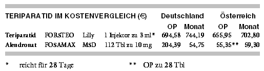 µg s.c. gegenüber dem Bisphosphonat Alendronat (FOSAMAX; monatlich 55 € für täglich 10 mg per os) auf das 13,5fache (in Österreich