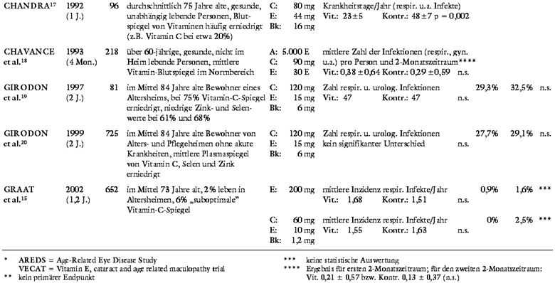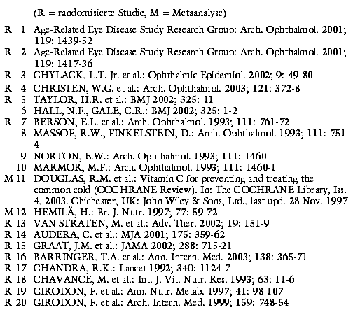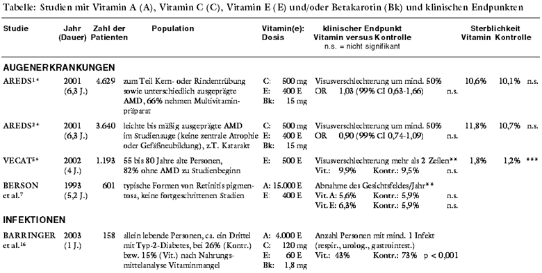 In sechs Studien15-20 wird der Nutzen von Multivitaminen (Vitamin A oder Betakarotin plus Vitamin C und Vitamin E, zum Teil kombiniert mit