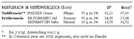 KOSTEN: Die zweimal tägliche äußerliche Anwendung (jeweils 1 g) von Nadifloxacin (NADIXA) kostet im Monat 37 € und damit das Doppelte einer örtlichen Behandlung mit einem preiswerten 2%igen Erythromycin-Externum (z.B. ERYDERMEC 18 €) und 15% mehr als AKNEMYCIN (33 €).