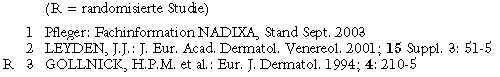 WIRKSAMKEIT: Ein als Pilotstudie bezeichneter zehnwöchiger klinischer Vergleich mit 2%igem Erythromycin liegt vollständig veröffentlicht vor. Von den ursprünglich randomisierten 48 Teilnehmern werden 16 (33%) wegen Protokollverstößen von der Auswertung ausgeschlossen.3 Wie viele Personen die Studie ordnungsgemäß beenden und wie viele letztlich analysiert werden, bleibt offen. Das Ergebnis - kein signifikanter Unterschied zwischen Erythromycin und Nadifloxacin hinsichtlich der Zahl offener Komedonen, Papeln und Pusteln - hat daher keine Aussagekraft. Methodisch gute klinische Vergleichsstudien zur Resistenzentwicklung von P. acnes bei Aknepatienten sind nicht veröffentlicht.