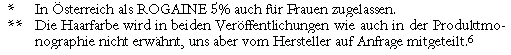 Haarwuchsmittel zugelassen, in den USA beispielsweise seit 1991. Hierzulande gab es bislang nur eine 5%ige Zubereitung für Männer (REGAINE 5%, a-t 2000; 31: 75-6).* Zulassung (dunkelhaarige Männer zwischen 18 und 49 Jahren) und Fachinformation ("nur