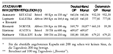 KOSTEN: Atazanavir (REYATAZ) ist mit monatlich 645 € nur auf den ersten Blick gleich teuer wie das Kombinationspräparat Ritonavir/Lopinavir